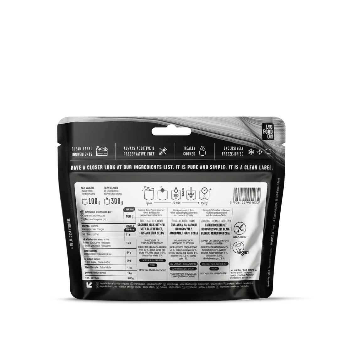 One of LYO’s greatest superstars. An absolute favorite not only among our customers but also among our ambassadors. Truth be told, we’re not surprised. Gluten-free oats cooked in coconut milk and combined with blueberries from the mountains, chia seeds, and a touch of agave syrup to make it sweeter but not overly sweet. Rounded off with chunky fig slices. LYO Blueberry & Fig Porridge will provide you with long-lasting energy for the day ahead, whether you're heading to the mountains or running errands in the city.