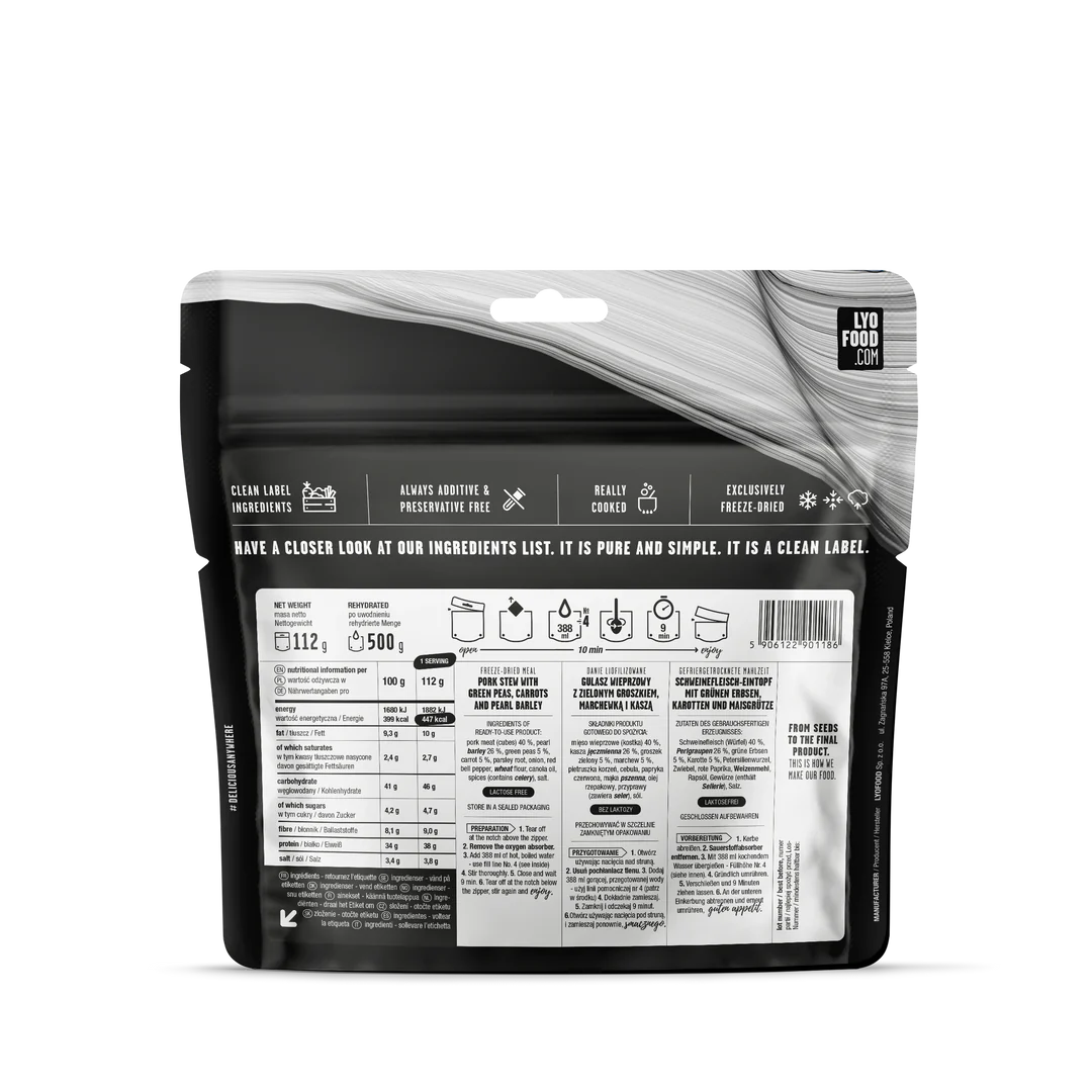 It’s easy to enjoy the outdoors with delicious food in your backpack. LYO Stew with Pearl Barley is a well-balanced dish created to give you plenty of energy for the final stretch of any adventure. Imagine tender pieces of pork and pearl barley dipped in a creamy sauce with a generous portion of veggies, including carrots, red bell peppers, green peas, parsley root, and onions. Packed with carbohydrates and protein, this is the perfect fuel for what’s waiting for you just around the corner.